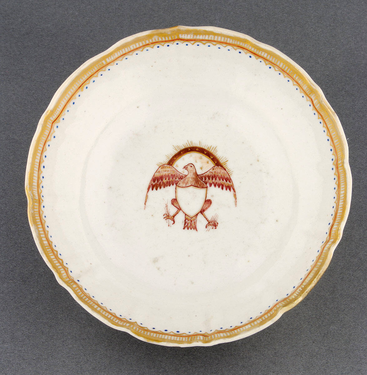 DescriptionBowl with American eagle, gold, salmon and blue dotted borders.