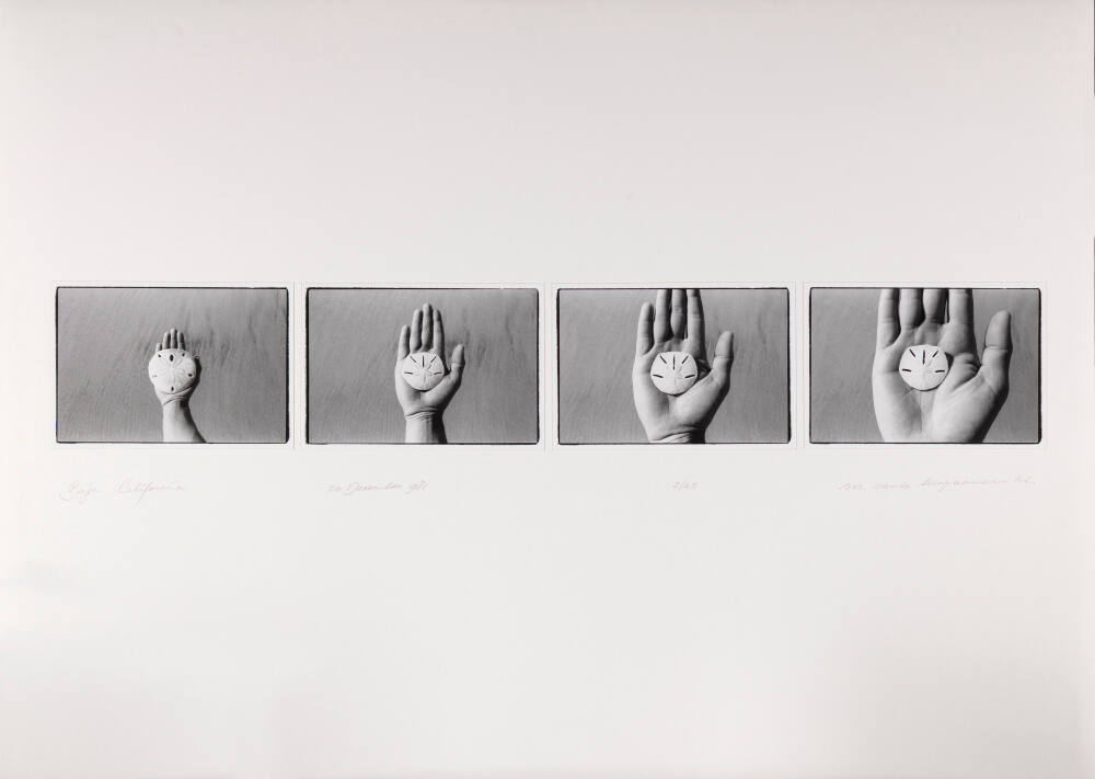 DescriptionFour photographs mounted horizontally on a single mount. Each image is of a sand dollar held in the palm of a hand. When viewing the images from left to right, the sand dollar appears smaller and the hand appears larger.Gallery LabelMichel Szulc Krzyzanowski uses sequential imagery to demonstrate how photographic "reality" varies relative to time and place. In this sequence, he plays with scale and proximity to invert our expectations. While the artist’s hand appears to grow as it approaches the camera, the sand dollar he holds seems to maintain its size. This clever maneuver creates the illusion that the sand dollar is shrinking, when in fact the artist is holding different sand dollars from frame to frame.