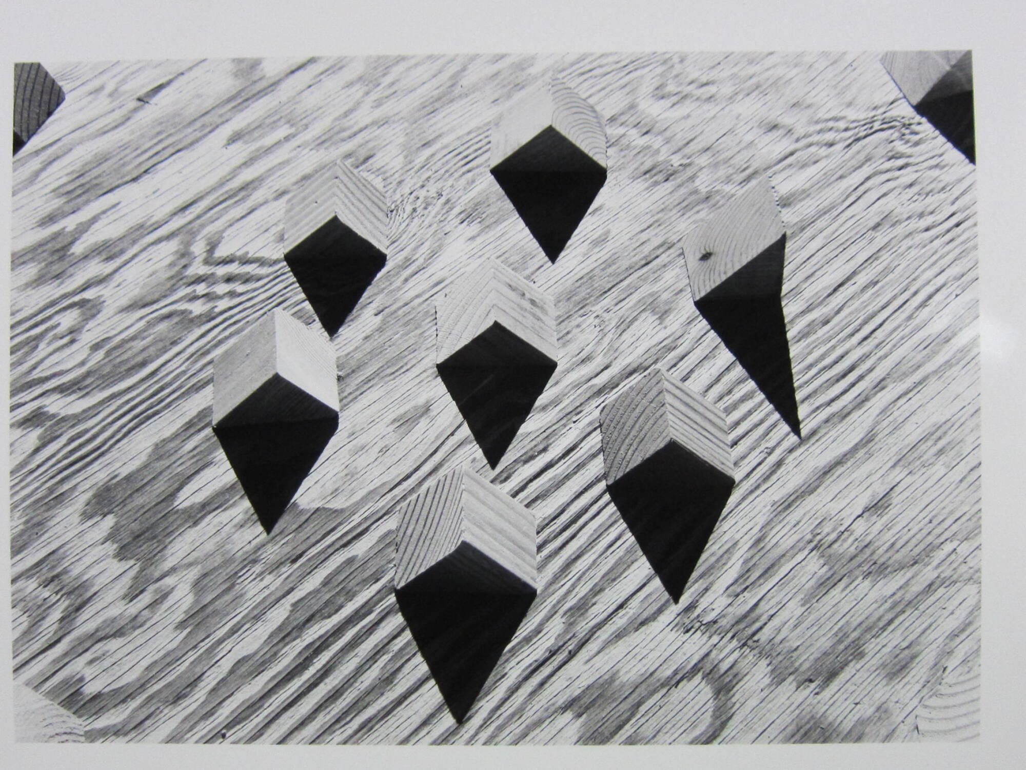DescriptionImage of pieces of wood cut into triangles; their harsh shadows are visible on the rough wooden surface beneath.Gallery LabelTo make this still life, Graham Howe arranged a group of wooden blocks on a piece of plywood to contrast the wood grain patterns. These forms, when placed in bright light, cast dark shadows. Once photographed, their kite-like shapes pull our attention to the surface of the print, flattening the sense of three-dimensionality.