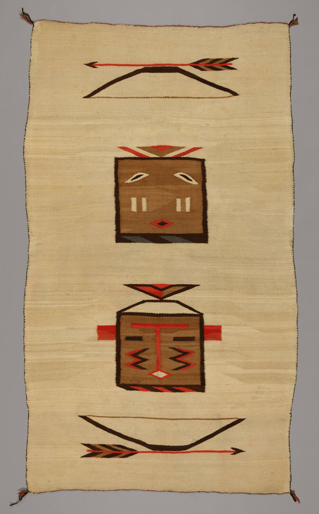 DescriptionWoven textile depicting two katsina masks with bows and arrows.ProvenanceSusan De Jong, Santa Fe, NM;