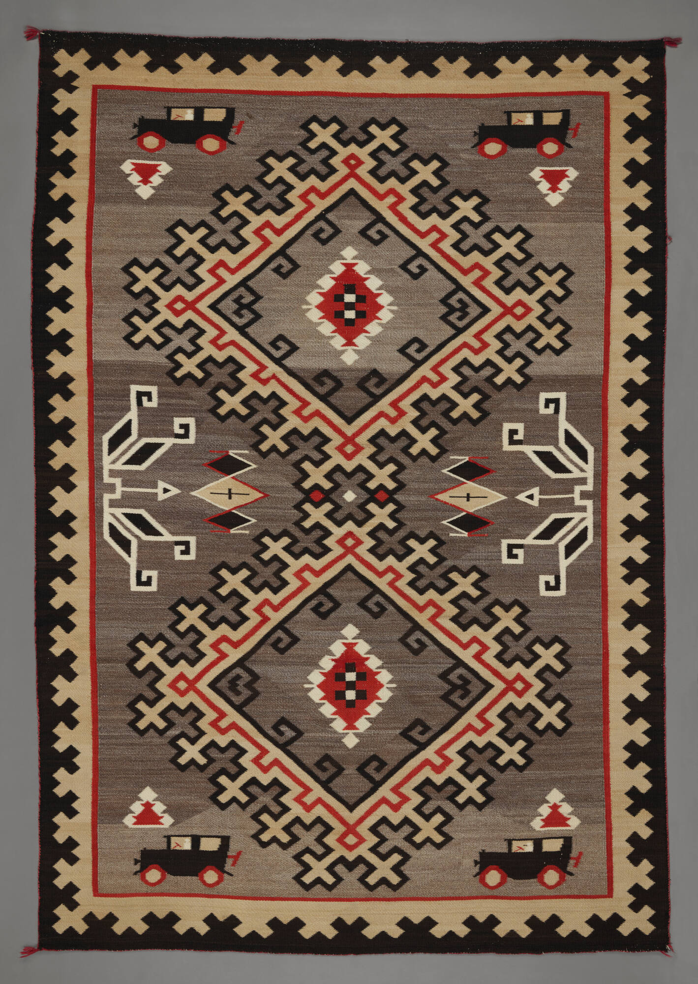 DescriptionTextile woven in red, black, grey and tan depicting four cars oriented at the corners, and geometric designs.ProvenanceSusan De Jong, Santa Fe, NM, 2019;