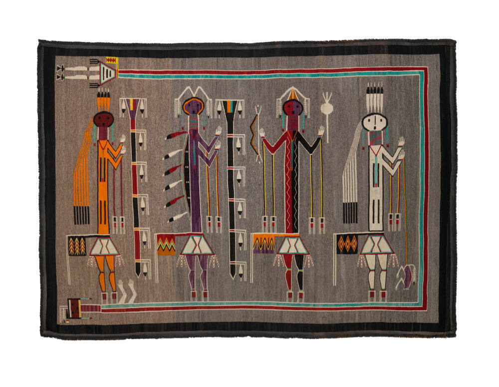 DescriptionSandpainting variant textile woven with four mythic figures depicted on a gray background with a black border and an outer fringe border. Each figure is holding a different ritual object.ProvenanceSusan De Jong, Santa Fe, NM;