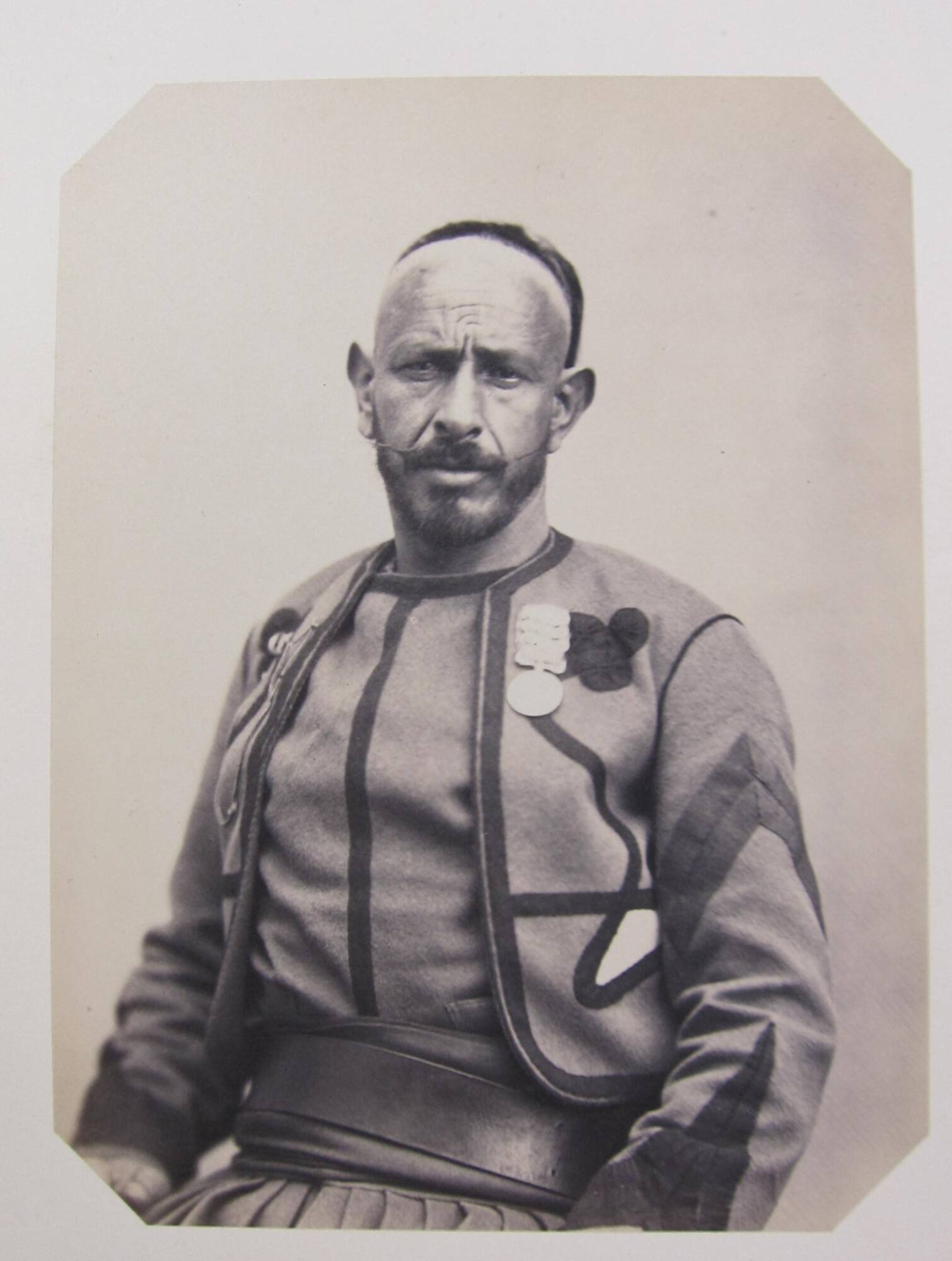 InscribedOn mount recto, bottom center, in black pen: "Ahmed ben Yelloub (34 ans) Caporal au 2éme / Tirailleurs Algériens Né á Oran. Taille 1 métre / 60 centimetres, cheveux noirs, yeux bleus; fils / de pére turc et de mére Arabe / Phot. en 1865"