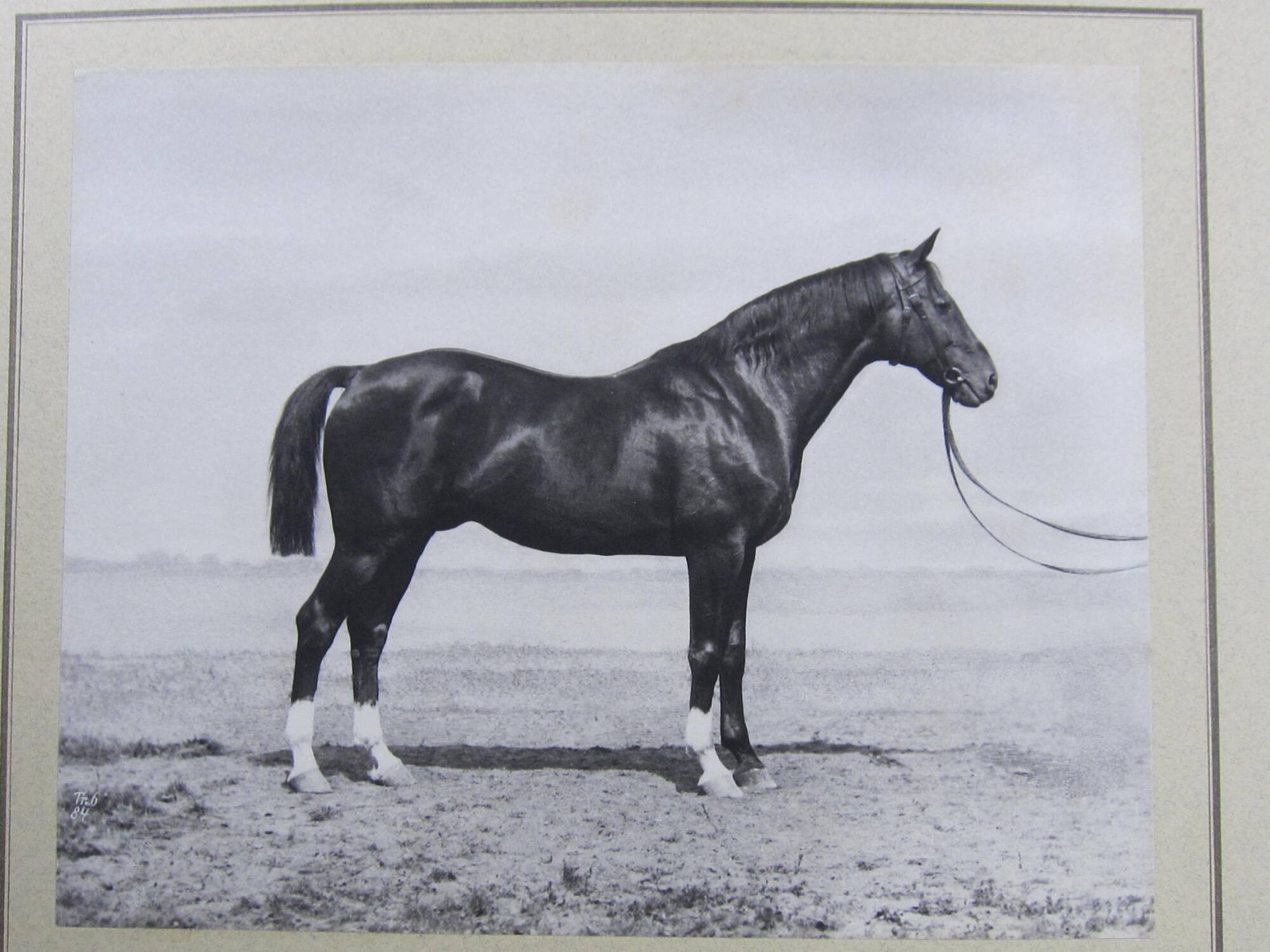 White label attached to mount recto, bottom center, printed in black ink: "Trakehnen, Royal Principal Stud. / Malteser III (main sire). Light brown [color], 1.72 meters, born in Trakehnen in 1872 from Lelio and dam Malagamba. / Stud book supplement / No 21"