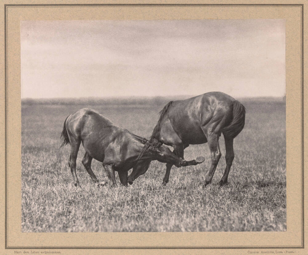 This photograph was taken at a military horse-breeding center in Trakehnen, Prussia (present-day Yasnaya Polyana, Russia). In the early 1880s, Ottomar Anschütz gained notoriety in the scientific and photographic communities for his high-speed photography. Anschütz’s incredibly fast exposures (images made within 1/1000th of a second) convey the distinctive light build and dynamic energy of the Trakehner breed of horses.