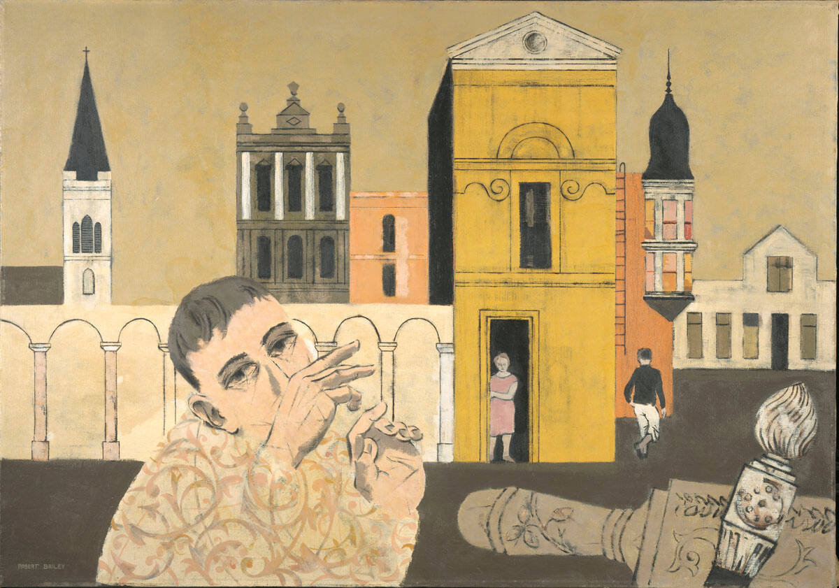 DescriptionGesticulating, bust-length figure, male, foreground; street, middle; succession of flat facades, rear. Woman in doorway; man walking away, right, into square.Copyright© Estate of Robert Bailey