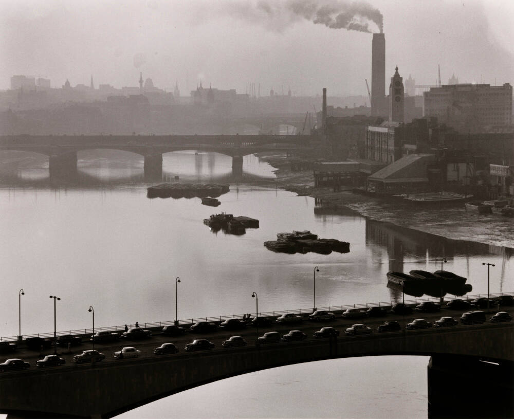 DescriptionImage of two bridges; evenly spaced cars travel in both directions across the bridge. Industrial buildings line the shoreline along the right edge of the frame.ProvenanceThe Hall Family Foundation, Kansas City, MO, 2020;