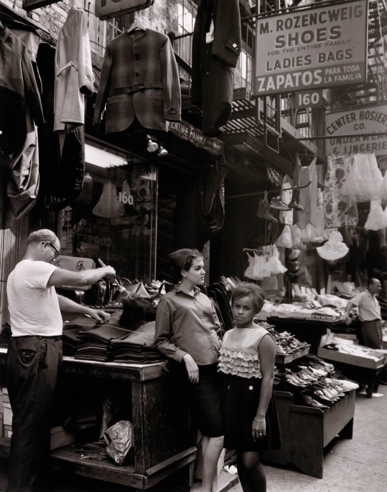 DescriptionImage of a row of shops with tables set up on the sidewalk. A man uses a feather duster on a pile of pants while two young women stand nearby. Jackets and other garments hang from above.ProvenanceThe Hall Family Foundation, Kansas City, MO, 2020;