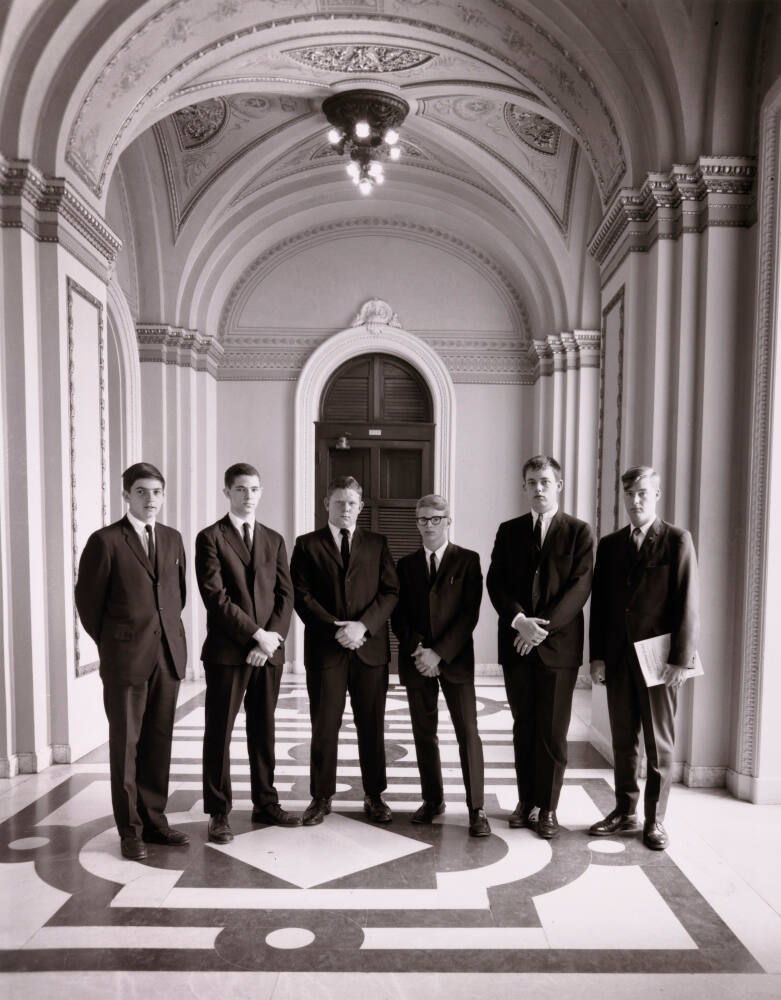 DescriptionImage of six young men standing beside one another in a hallway with elaborate moldings and an arched ceiling. They are all similarly dressed in dark suits with ties.ProvenanceThe Hall Family Foundation, Kansas City, MO, 2020;