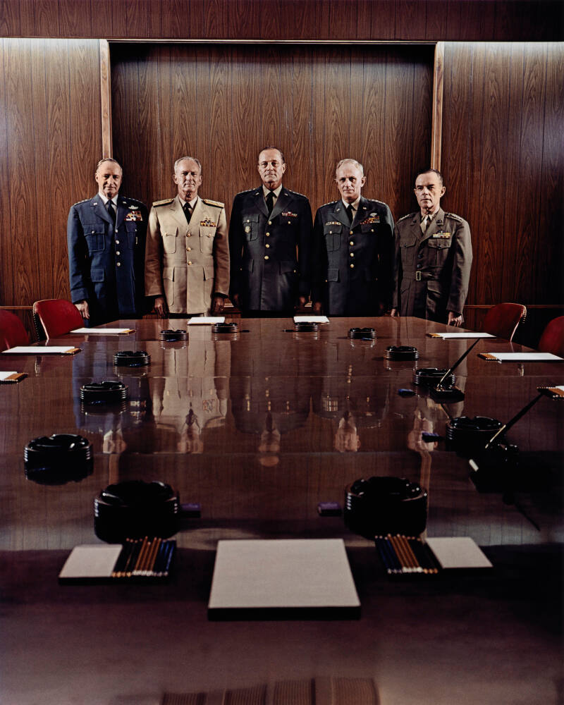 DescriptionImage of five men standing at the end of a long conference table. The table is set with individual pens and notepads. They are dressed in military jackets with ties and insignia pinned above their left breast pockets.ProvenanceThe Hall Family Foundation, Kansas City, MO, 2020;