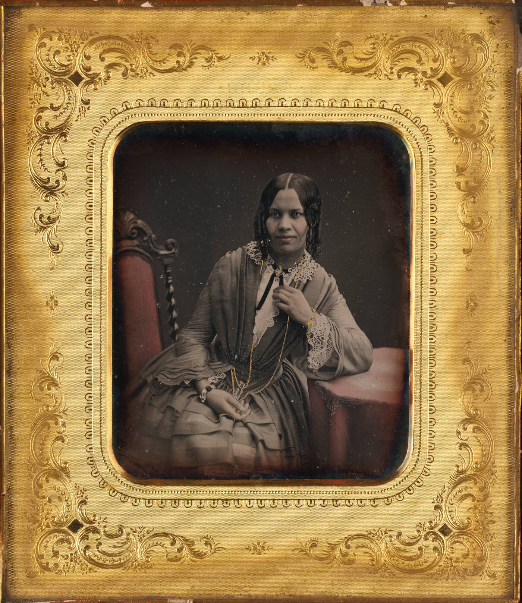 DescriptionImage of a woman seated with her elbow resting on a round cloth-covered table. Her hair is parted in the center and she's wearing a long-sleeved dress with a pleated skirt and lace collar. This quarter (or sixth?) plate cased daguerreotype is housed in a decorative mat with double elliptical opening (possibly made of thin foil) inside of a leather-textured paper covered case with floral motifs at the corners, gold tooling, and an embossed deep purple velvet liner.ProvenanceHall Family Foundation, Kansas City, MO, 2020;