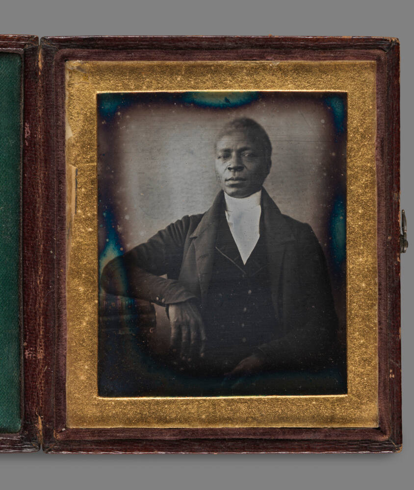 DescriptionImage of a man seated with his elbow resting on a side table. He is dressed in a shirt with a tall collar and layered jackets. This sixth plate cased daguerreotype is housed in a gold colored mat inside of a case with small flowers stamped at the corners and a green silk liner.ProvenanceHall Family Foundation, Kansas City, MO, 2020;