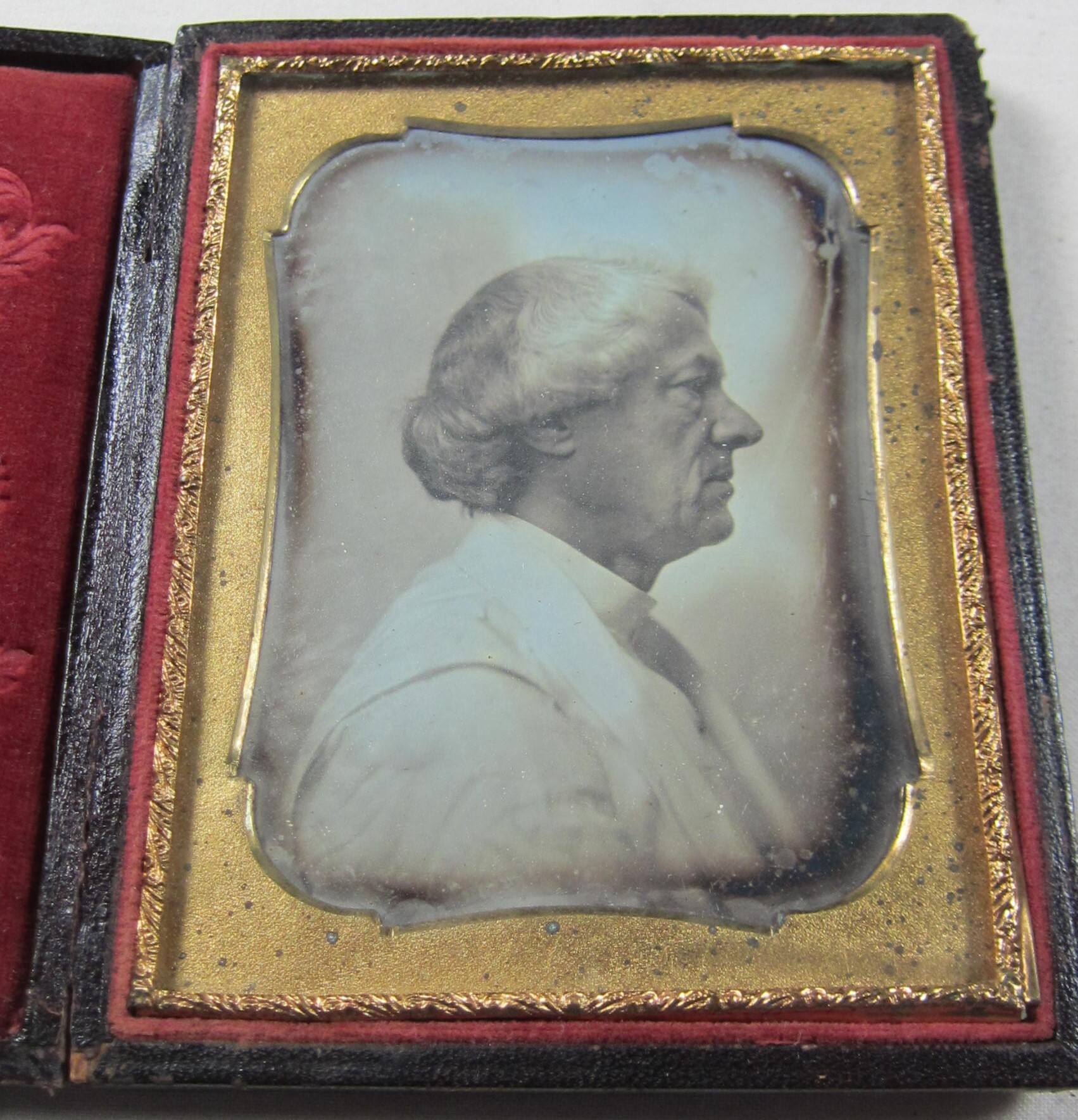 DescriptionImage of an older man in profile. He's wearing light colored clothing. This quarter plate cased daguerreotype is housed in a brass mat inside of a leather covered case with an embossed floral motif, gold tooling, and an embossed red velvet liner.ProvenanceHall Family Foundation, Kansas City, MO, 2020;