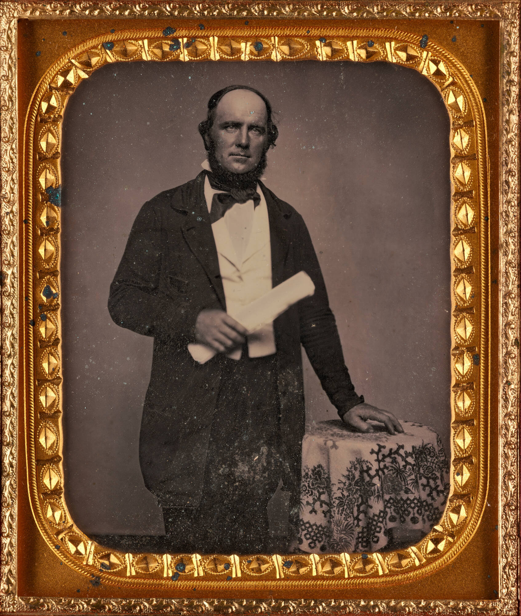 DescriptionImage of a bearded man standing with one hand resting on a small round cloth covered table. He's wearing a suit with bow tie and holds a rolled up piece of paper in his other hand. This sixth plate cased daguerreotype is housed in a brass mat inside of a paper-covered wooden case with an embossed floral motif and an embossed red velvet liner.ProvenanceHall Family Foundation, Kansas City, MO, 2020;