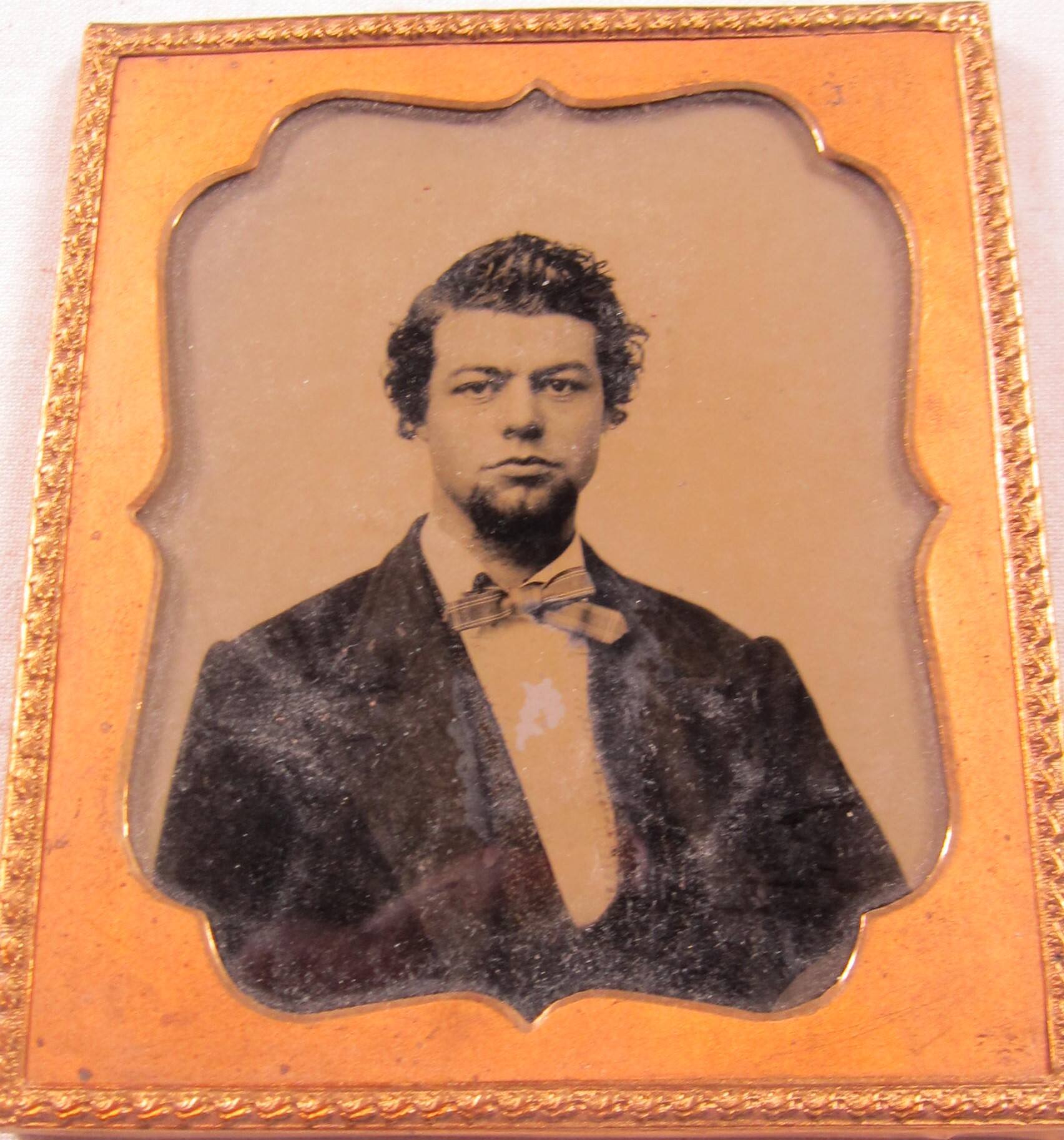 DescriptionImage of man with a goatee. He's wearing a collared shirt with striped bow tie, vest, and a dark colored jacket. This sixth plate uncased tintype is housed in a brass mat.ProvenanceHall Family Foundation, Kansas City, MO, 2020;