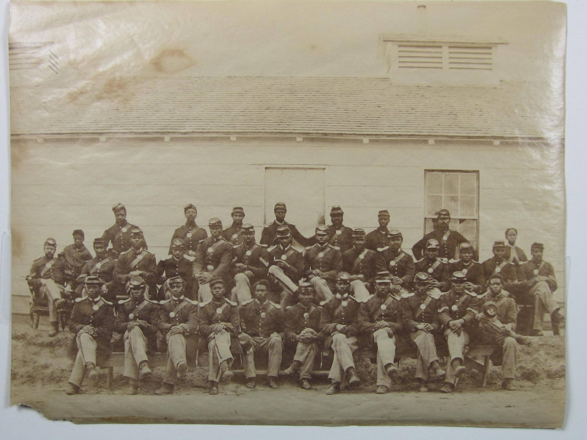 DescriptionImage of a group of uniformed men arranged in three rows in front of a building; many of them are seated with their legs crossed. Their uniforms are composed of light pants, dark jackets with shiny buttons, small brimmed caps, and a strap across the chest with a round emblem.ProvenanceHall Family Foundation, Kansas City, MO, 2020;
