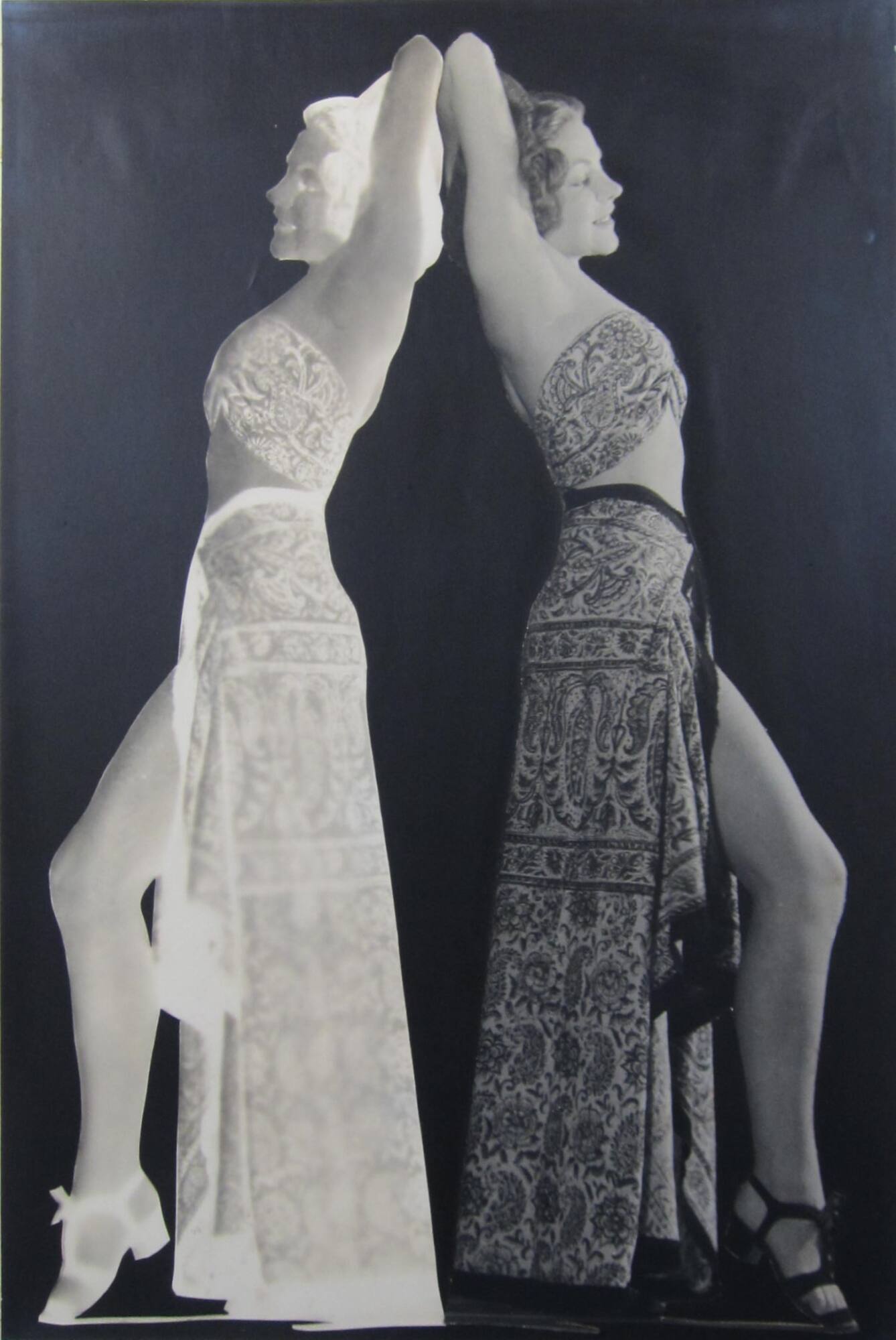 DescriptionImage of a woman standing in profile with her arms behind her head. She's dressed in a strapless top that exposes her midriff and a long skirt with a slit up the front. This image is collaged next to an image in negative form which is reflected onto the left half of the frame so that the figures appear to stand with their backs together.ProvenanceHall Family Foundation, Kansas City, MO, 2020;