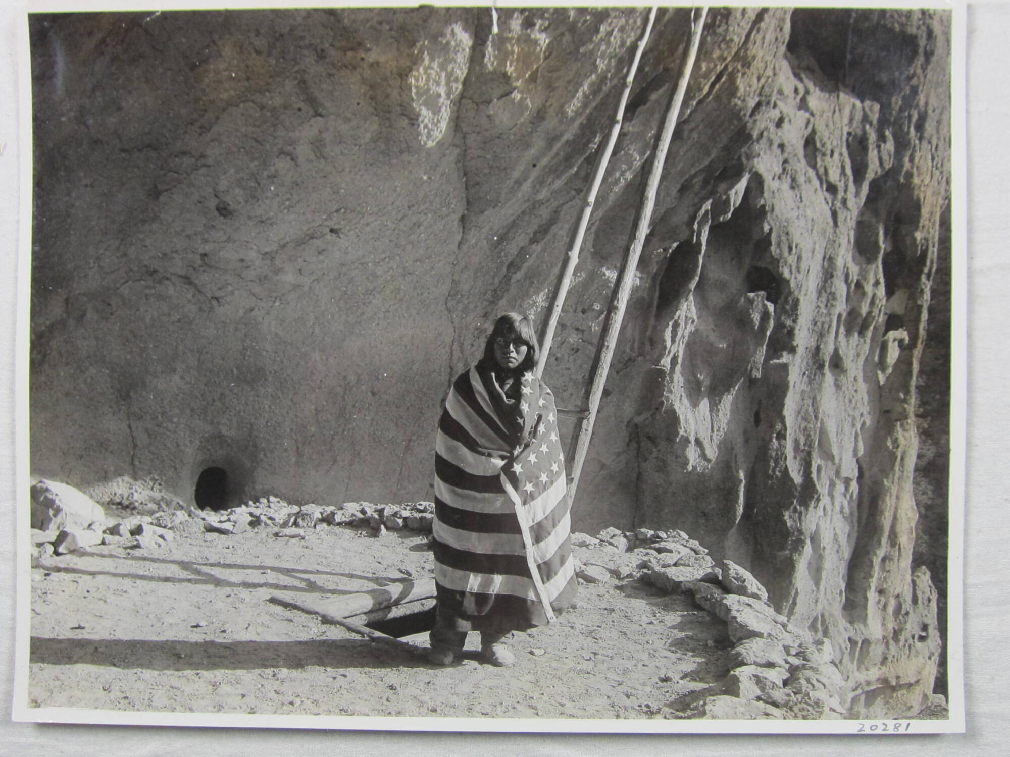 InscribedOn sheet verso, center, on white label, in blue type with black pen: “20281 [crossed out / VV / 3860 / A Real American. At the Kiva of one of the pre Historic / cliff dwellers. This council chamber is subtarnean [sic], the / entrance being the small rectangular opening directly / behind the figure. It is situated four hundred feet / above the level of the valley. It can only be reached by / ladders.”