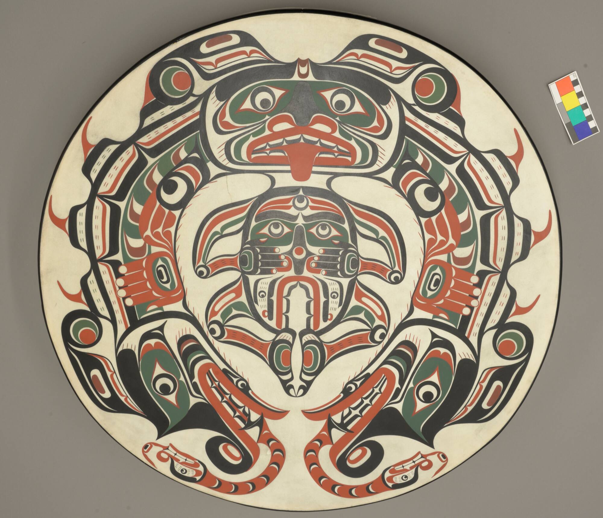 DescriptionCircular drum with a painted image of "Sisiutl Hunter." The Beater is carved from a single piece of cedar in the form of a bear totem.ProvenanceSusan and Clinton Nagy, Los Altos, CA;