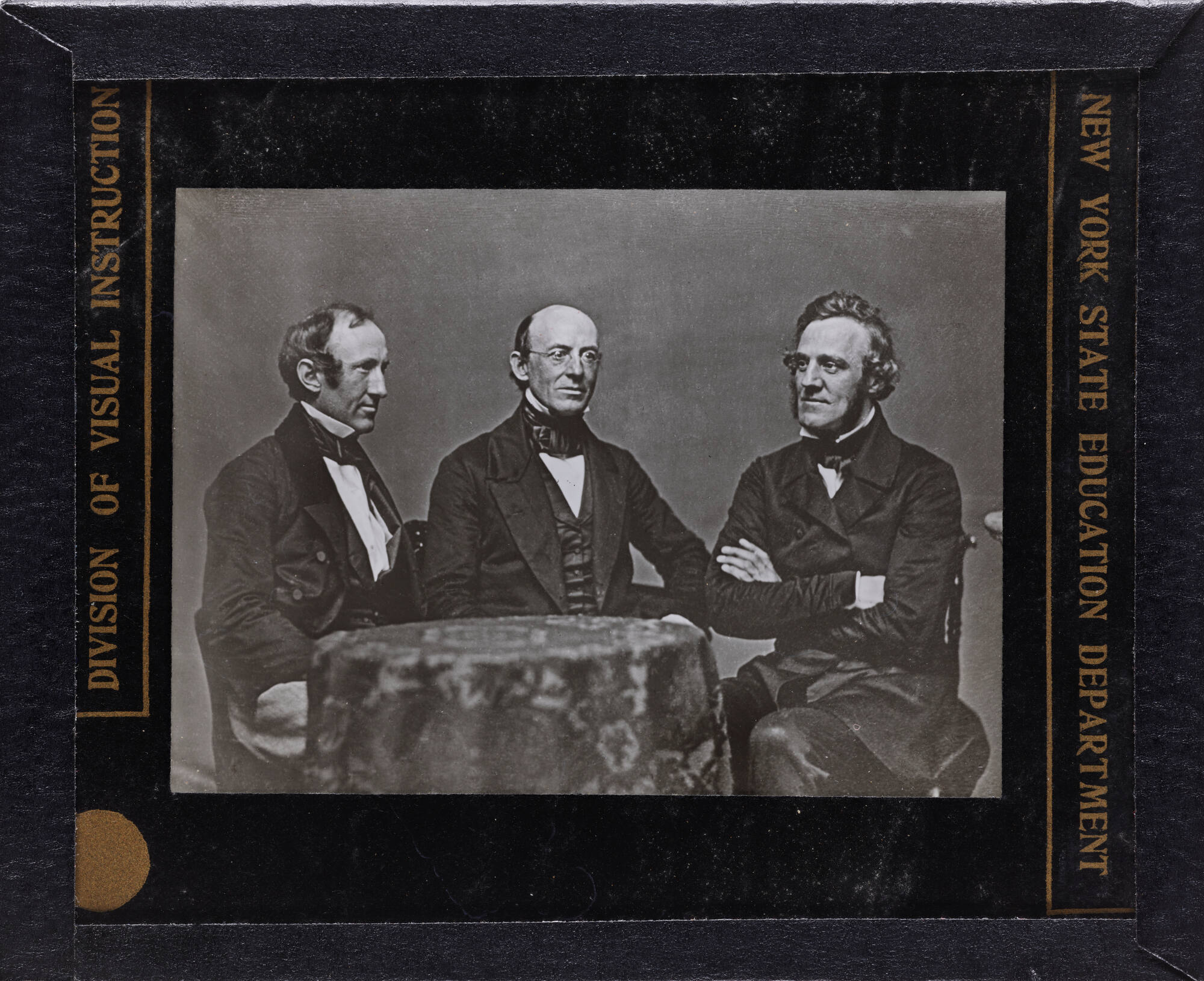 DescriptionImage of three men seated next to one another behind a round table with a patterned table cloth. The men are dressed in dark suits with ties. The man in the center wears glasses and the man on the right is seated with his arms crossed.ProvenanceEugene R. Groves Collection of 19th Century Photography;