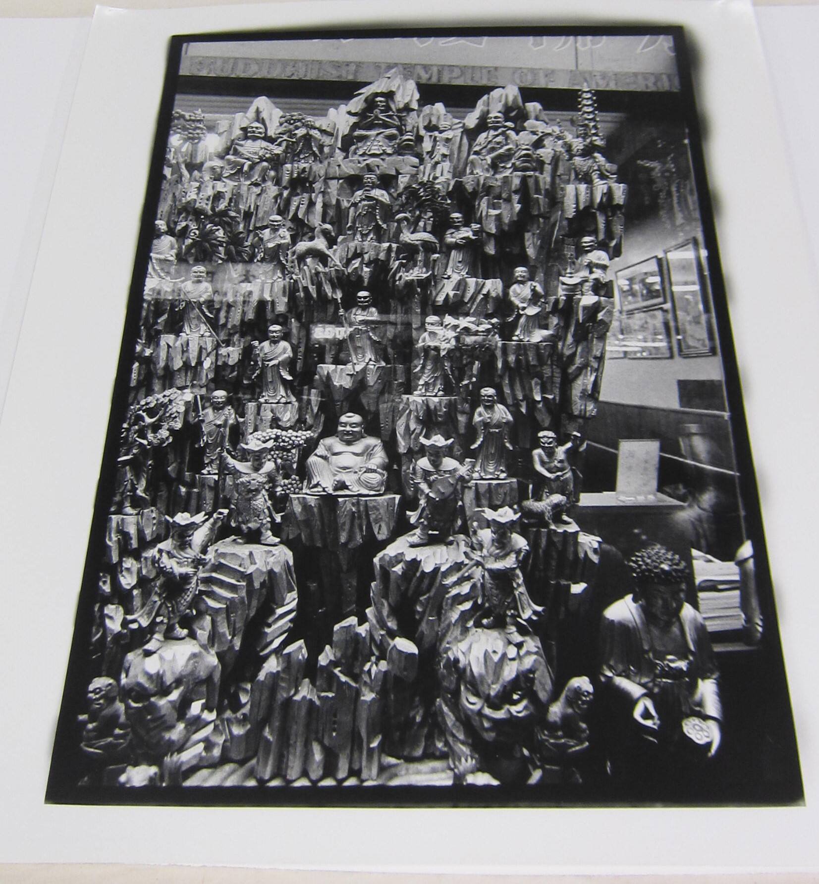 DescriptionImage of figures of Buddhas, bodhisattvas, and other entities all resting on carved wooden platforms which span the entire length of the frame. A sign at the top reads "BUDDHIST TEMPLE OF AMERICA".ProvenanceGeorge Segal, New York, NY;