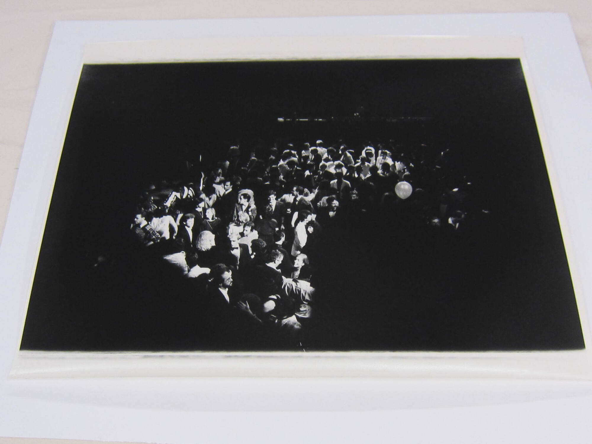 DescriptionImage of a crowded room with people dressed in formal attire. The room is dark but a bright light illuminates a section of the crowd near the center of the image. There is a single balloon floating center right.ProvenanceGeorge Segal, New York, NY;