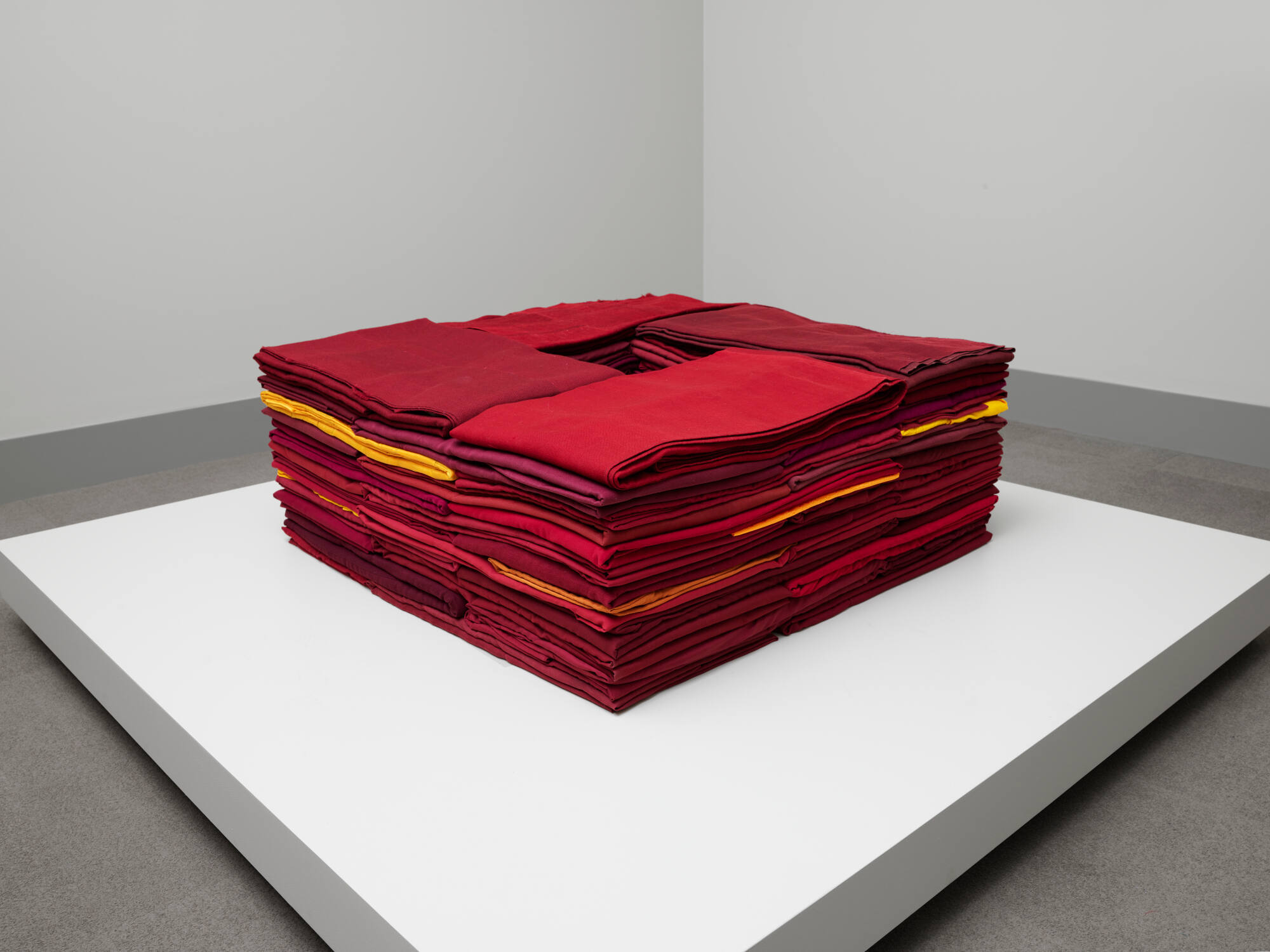 Description"My Father’s Death" is an installation work that assembles 49 discarded Tibetan monk’s robes, carefully folded and stacked to form a well in the center. The robes are various shades of maroon, some showing obvious wear. These robes are carefully folded and pinned in place. Each is numbered, 1-49, which indicates their placement in the construction of the sculpture. Nine conical molded plaster forms, known in Tibetan as tsa tsa’s are placed on the center in three rows of three, creating a square arrangement.Exhibition History