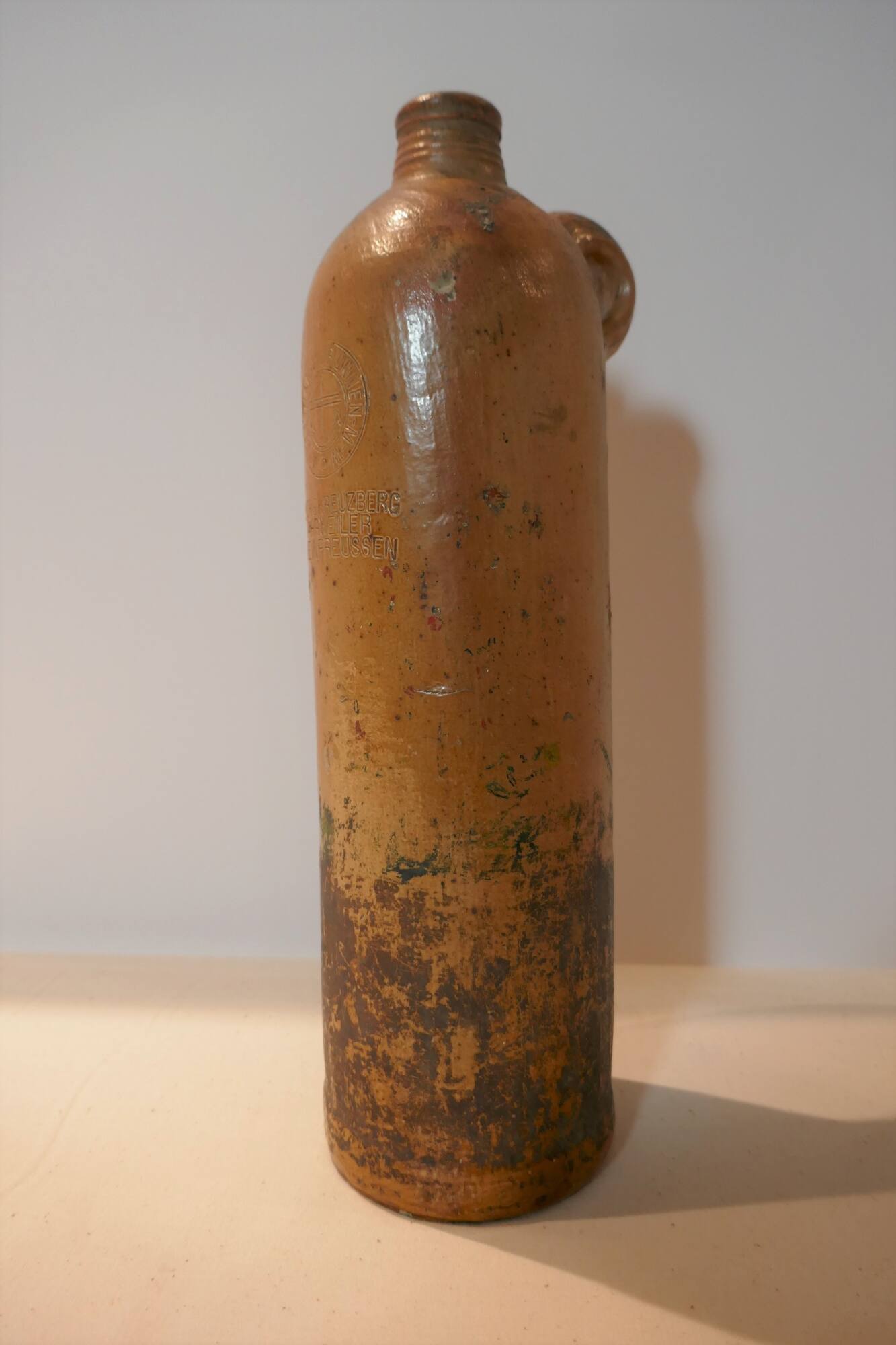 InscribedAn embossed inscription is located on the upper portion of the vessel body with the supplier’s name, anchor logo and source of mineral water. At the base of the handle is No. 23 probably indicating the size of the vessel.