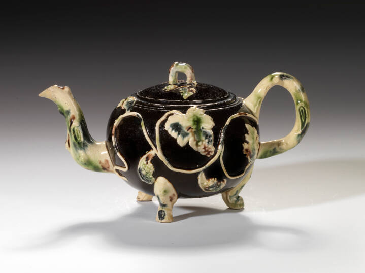 Gallery LabelTeapots such as this were often inspired by silver forms, while decoration was often informed by imported Chinese redware or porcelain examples.