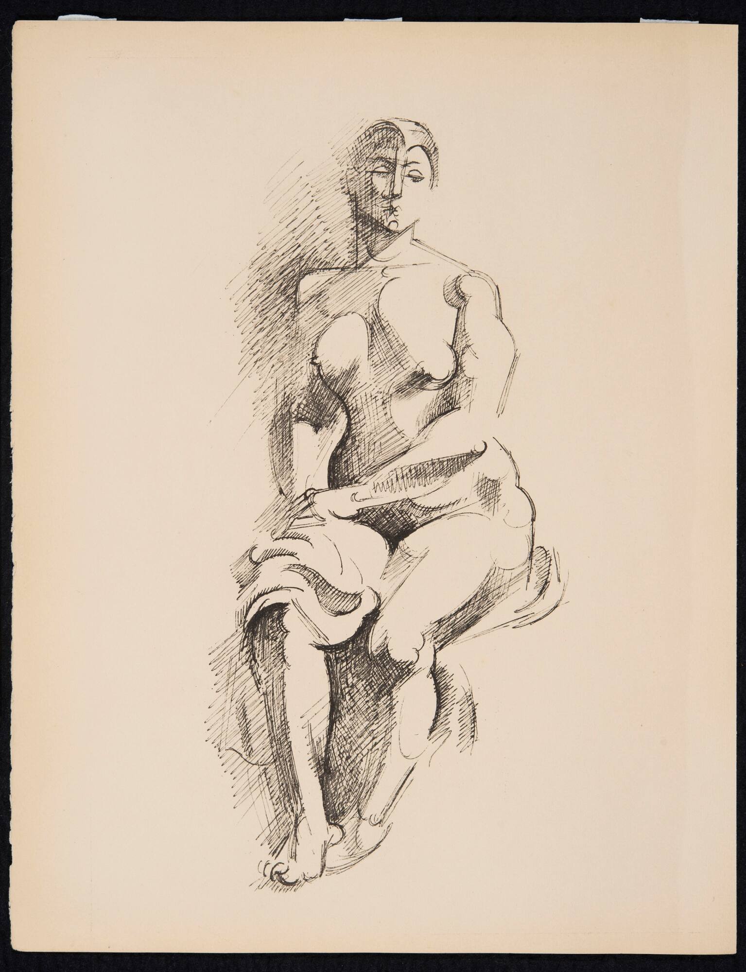 DescriptionEtching of a seated female nude. With her torso facing the viewer, her legs face slightly toward the viewer's left with her right foot placed in front of her left foot. Her hands are clasped and she holds a shawl against her right thigh. Her athletic build is rendered realistically, however, her head and helmet-like hair appears in a more angular, cubist style. She looks out at the viewer with her head turned slightly to the viewer's right toward the direction of the light source. Shading falls along the figure's proper right side.Copyright© Artists Rights Society (ARS), New York / ADAGP, Paris