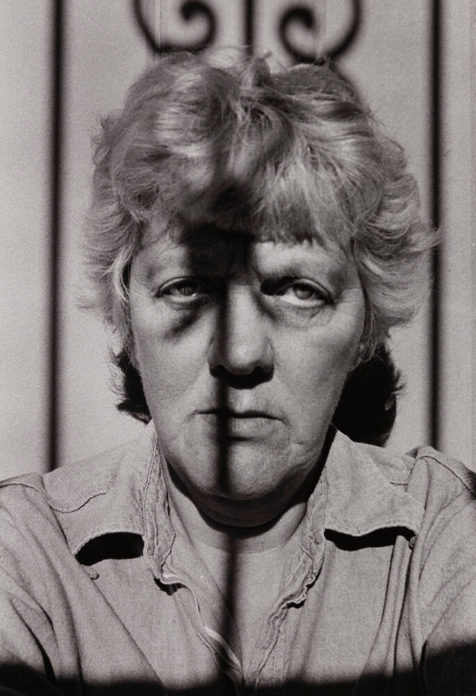 DescriptionImage of a woman with short hair wearing a wrinkled collared shirt; a vertical shadow is cast down the center of her face.ProvenanceAnne Noggle Foundation, High Springs, FL;