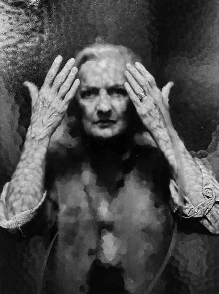 DescriptionImage of a woman standing behind a pebbled sheet of glass which softens her facial features. Her hands are raised beside her head with her palms are facing away from the viewer.ProvenanceAnne Noggle Foundation, High Springs, FL;