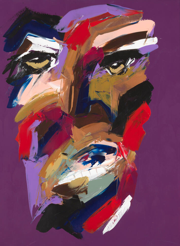 DescriptionThis vertically oriented painting is composed of a broad strokes of acrylic paint that have been applied to the canvas with a palette knife, rather than a brush. In some areas the red, blue, lilac, fuchsia, brown, white, black, and tan strokes are laid down next to each other and in other places (especially near the center of the lower third of the painting) they mix and blend. Together, the strokes create a human face that nearly fills the canvas. This face, made more recognizable by eyes near the top quarter of the canvas, is set against a deep purple background.ProvenancePurchased from Harold David Smith by The Nelson-Atkins Museum of Art, Kansas City, MO, 2021.