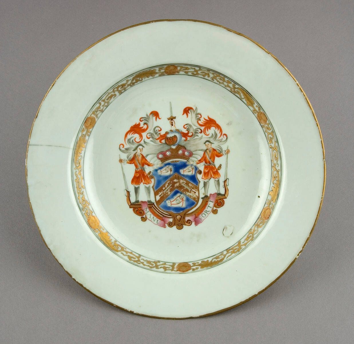 DescriptionPlate with Coat-of-Arms of Baron Reay Mackay in blue, red, and gold, consisting of two red-coated figures with rifles on either side of escutcheon which bears the inscription MANU FORTI; gilt scroll and folate border on cavetto; shoulder is plain except for narrow gold rim.