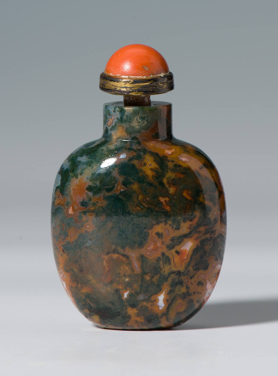 DescriptionOf ovoid form, with indented base, the stone a swirling confusion of greens, reds, yellows, whites, and oranges.