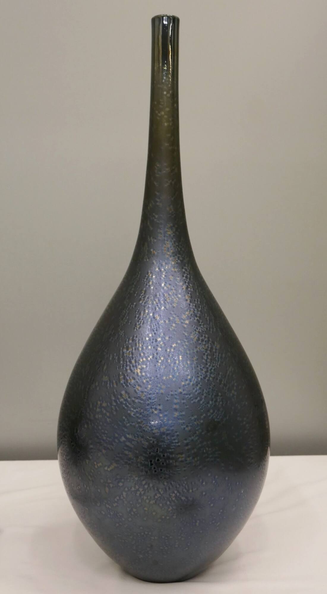 DescriptionA large tear drop form with an elongated slender neck. A dark blue small crystalline iridescent glaze starts on the neck and continues over the entire surface of the bulbous tear drop vase.Copyright© Hideaki Miyamura