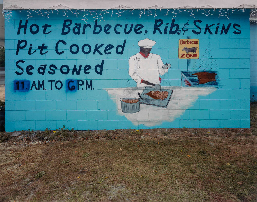DescriptionImage of the side of blue colored wall with a painted sign that depicts a figure wearing a chef's hat and white jacket holding a bottle of seasoning while cutting up meat. Dark blue text near the figure reads: "Hot Barbecue, Ribs & Skins Pit Cooked Seasoned 11 A.M. TO 6 P.M." A stretch of grass runs along the bottom third of the frame.ProvenanceJim Dow, Boston, MA, 2021;