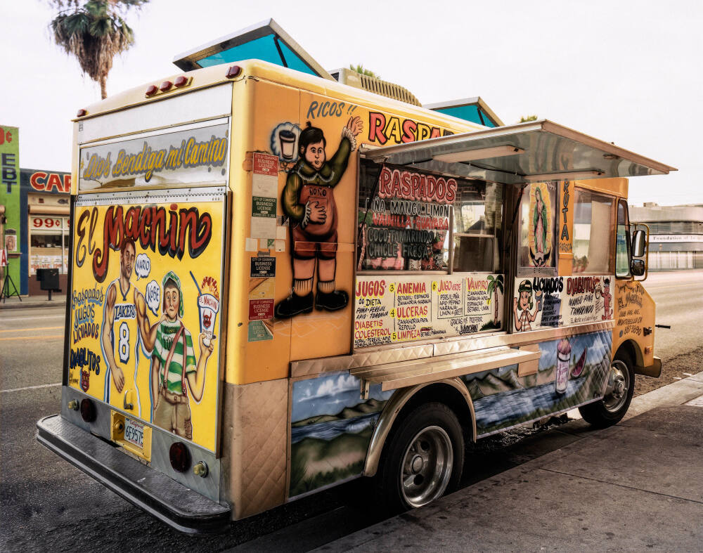 DescriptionImage of a food truck parked along the side of a road. The truck is painted yellow and is covered in images and test. An awning is raised over a steel surface with the menu items listed above.Gallery LabelDow began to photograph Latino food trucks in 2004. He made several photographs in Los Angeles, noticing that a rich, culturally diverse mix of imagery often decorated the vehicles. This truck, known as “El Machín,” specializes in selling bionicos (fruit bowls with sweetened condensed milk) and raspados (shaved ice drinks) and features pictures of both the Virgin of Guadalupe and L.A. Lakers basketball star Kobe Bryant.
