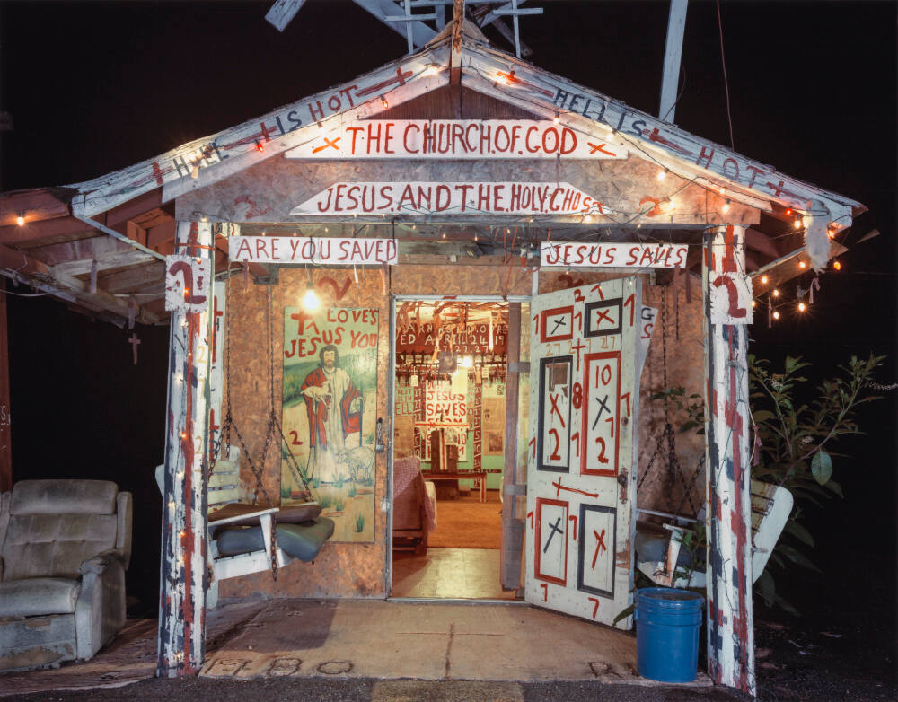 DescriptionImage of a small wooden structure with an open door flanked by white porch swings. The facade is covered in blue and red text against a white background. Above the door is a sign that reads "The Church of God".ProvenanceJim Dow, Boston, MA, 2021;