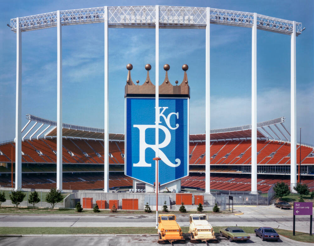 DescriptionImage of a large crown shaped display board with the letters KC and R in white against a blue background. In the background is a bright blue sky above tiered stadium seating with lights mounted above.Gallery LabelIn 1980, Dow began a project to photograph major league baseball stadiums across the United States. He took this photograph of Royals Stadium in 1982, a decade before the expansive renovations that added seating, clubhouses, a restaurant, a jumbotron, and changed the seat colors from orange to blue. It was renamed Kauffman Stadium in 1993.