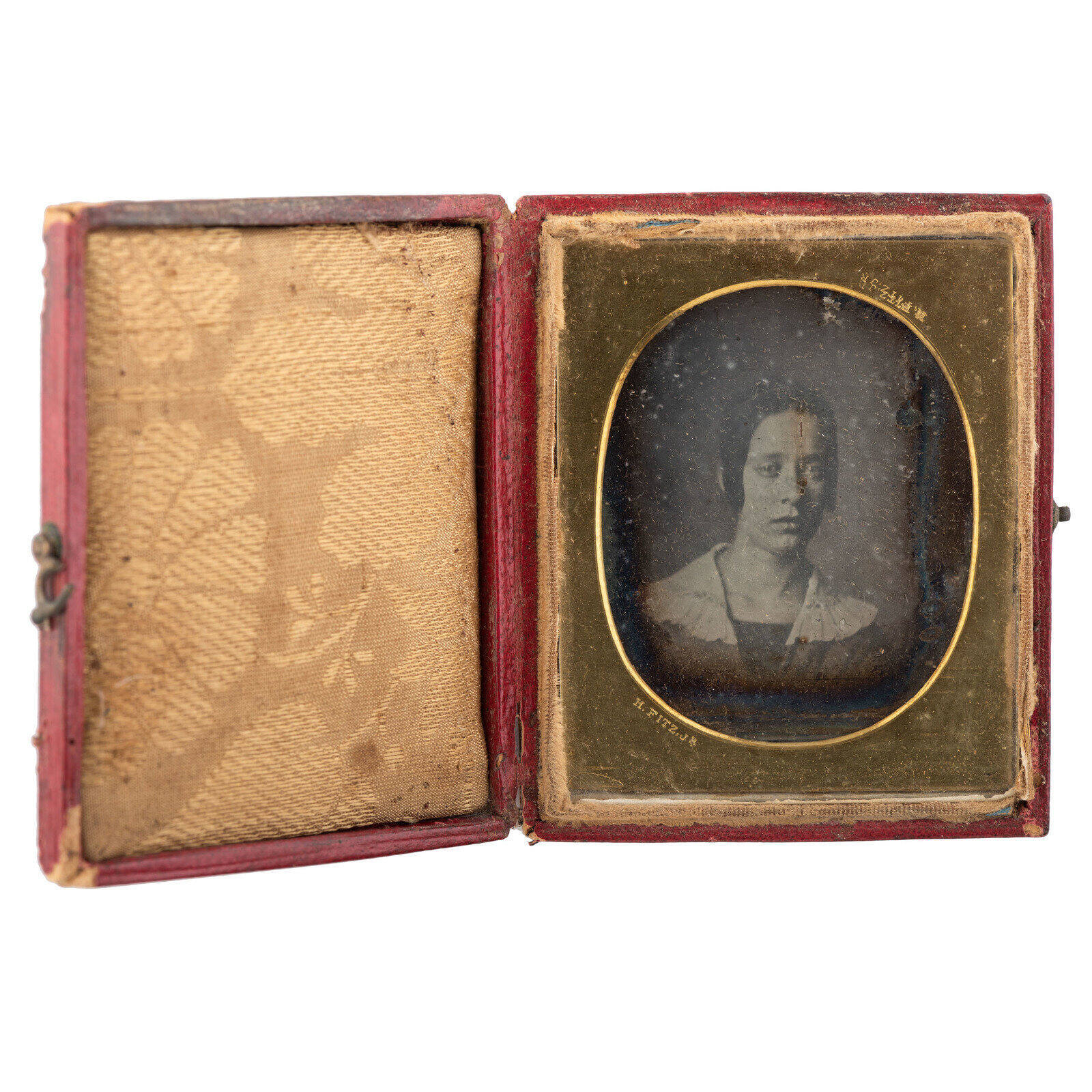 DescriptionImage of young woman, possibly Susan Fitz, wearing dress with wide collar. This ninth plate cased daguerreotype is housed in an oval brass mat inside of a plain red leather case with gold floral fabric liner.
