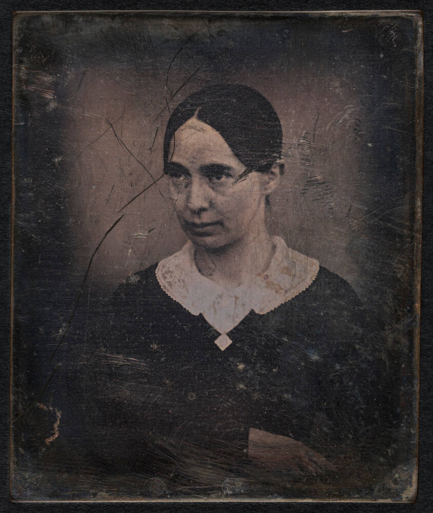 DescriptionImage of a seated woman, possibly Susan Fitz, with arms crossed. She is wearing a dress with a lace collar. Her hair is parted in the center and pulled back above her ears. This is an uncased ninth plate daguerreotype.