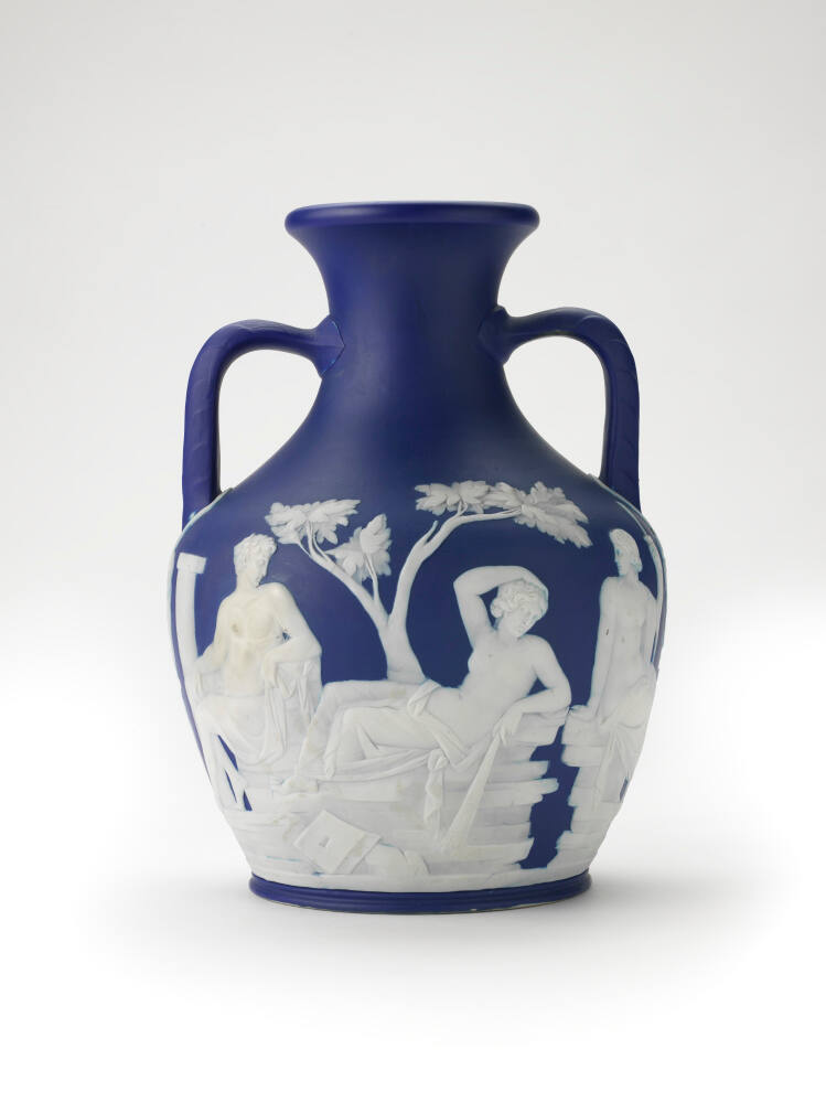 DescriptionOvoid vase with twin handles on neck in deep blue body color, applied moulded decoration in white.Gallery LabelThis vase is the most famous design the Wedgwood factory ever produced. It is an exact ceramic reproduction of a glass vase from the 1st century C.E. that probably told the story of the marriage of two Greek gods. The vase was excavated in Rome in 1580, and a British duchess bought it in 1783. Eager to capitalize on the popularity of ancient Greek and Roman subject matter among British consumers, Josiah Wedgwood charmed the duchess’s nephew into letting him copy it. After thirty failed attempts, he unveiled his ceramic version in 1790. The vase has never been out of production since.