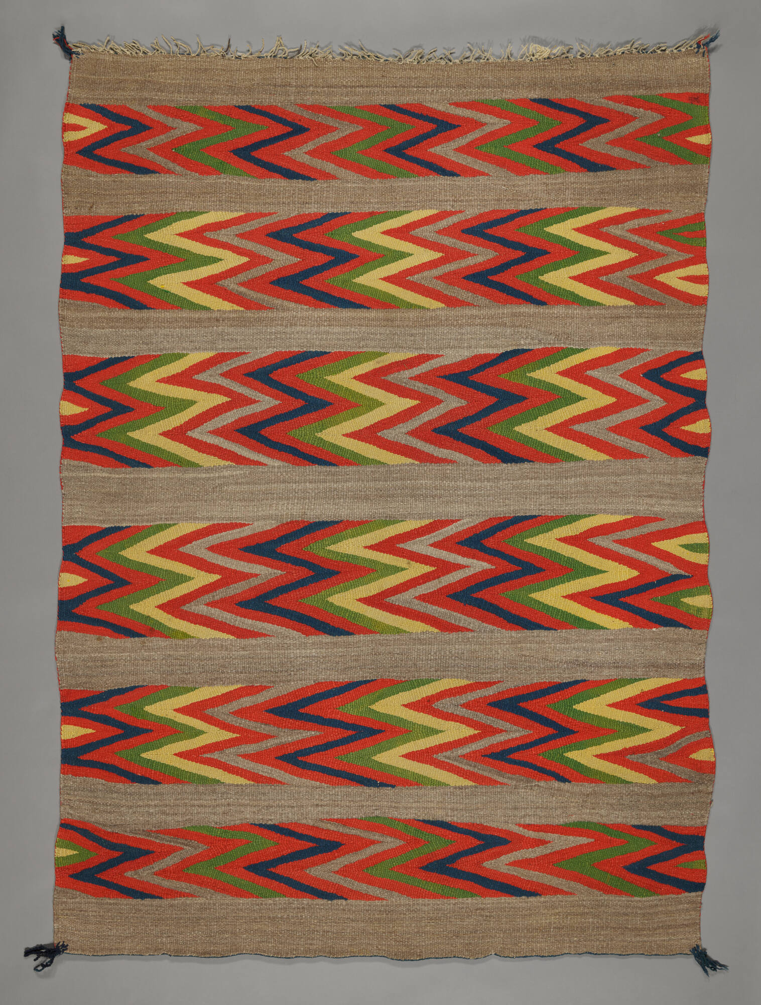 DescriptionThe background color of the weaving is a natural grey that appears as seven stripes that separate the other design elements. These elements are stripes of zigzag lines that employ pulled warp technique. The four central ones have two complete zigzags and are comprised of lines of natural grey, red, yellow, green, and dark blue. The lines nearest the end of the weaving are made up of one and one-half zigzags, and the lines are natural grey, red, green, and dark blue without the yellow accents. The long sides of the weaving have wavy edges because of the pulled warp.ProvenanceSusan De Jong, Santa Fe, NM;