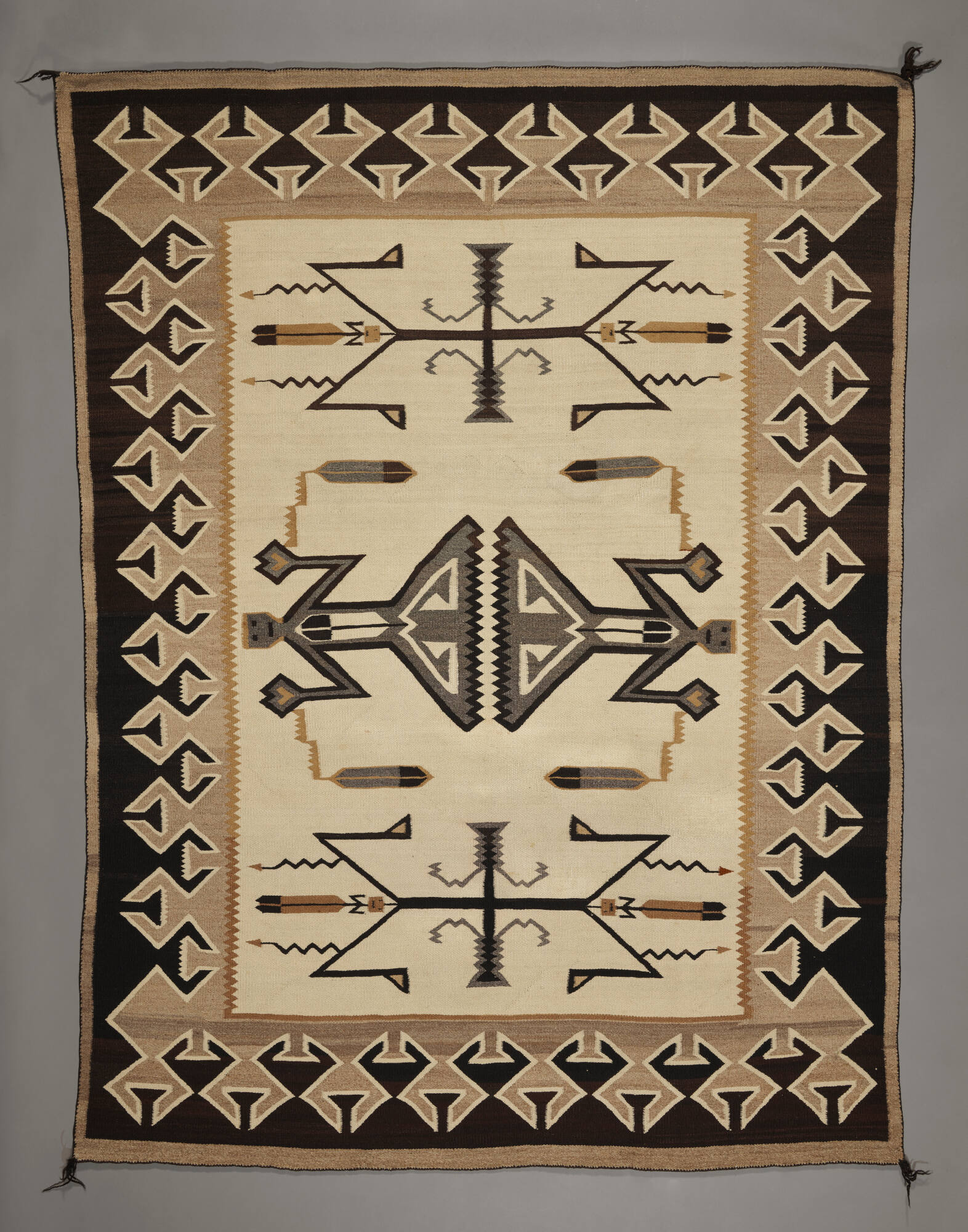 DescriptionA central diamond shape is divided into two triangles by serrate black edges. Inside the triangles a white abstract geometric figure appears on a grey background. These triangles serve as the lower body of an anthropomorphic figure that appears above each one in mirror image. Their upper bodies have two black and white feather designs on a grey background, and their arms are raised so that their hands are at the level of their heads. They appear on a large white rectangle with intricate black, grey, and brown designs on either side. The border consists of interlocking black and grey diamond shapes that are separated by a white line. The outside border of the piece is a simple grey band.ProvenanceSusan De Jong, Santa Fe, NM;