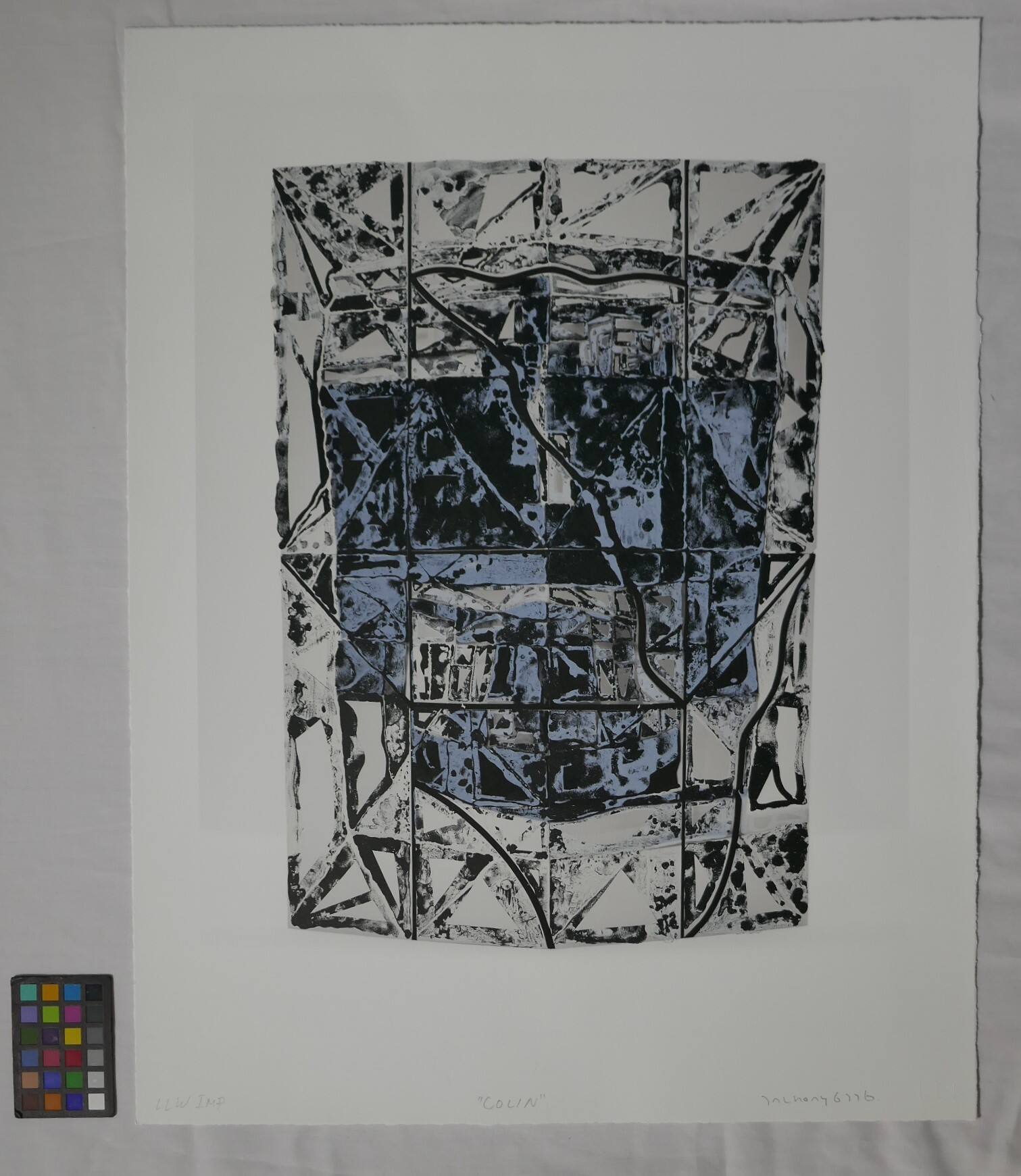 DescriptionImage in black, grey, and blue. Laid out in a rough graph with blue fields at the center, surrounded by grey fields. The bottom row is intersected with straight and arched lines that appear three-dimensional. A thick black line crosses the center of the print in a “reverse Z.” Plenty of activity going on in this print, but it’s difficult to tell what it is.Exhibition HistoryThe Lawrence Lithography Workshop: Highlights from the Archive. The Nelson-Atkins Museum of Art, Kansas City, MO. December 21, 2024 - June 22, 2025.