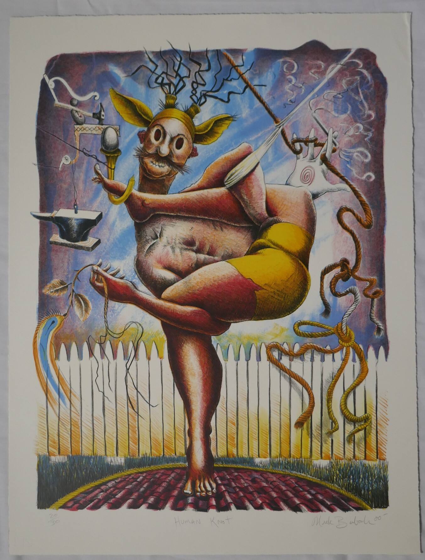 DescriptionHuman contortionist stands on its proper right foot and calf. Its yellow shorts cover its butt on the right. The proper left leg curves to point to the left. The man’s arms wrap around his legs and his bare torso occupies the center of the image. His head has a mustache, wide-open black eyes, and a cap with animal ears and black electric sparks emanating from it. The setting is a fenced yard with blue sky in the background. A rope in equally contorted design hangs on the right. A string of objects including a hook and a small anvil (?) hang on the left.ProvenanceC. Richard Belger and Evelyn Craft Belger, Kansas City, MO;