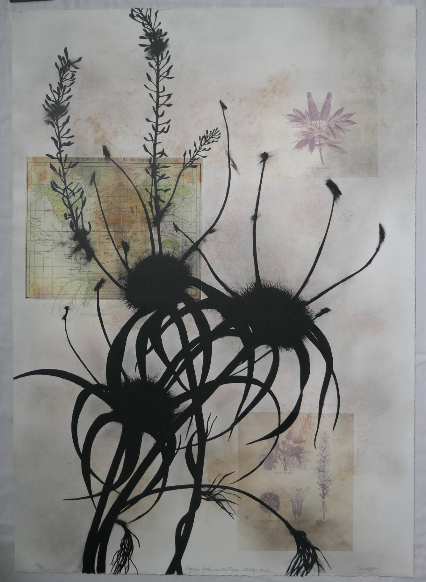 DescriptionAgainst a background of rubbed pale grey patches, three bold black stems and flower heads. There are no petals, only the centers with leaves curving down and stamens curving up. Two long leafy stems seem to grow out of the head of the upper left flower. An old map partially covered by a flower left on the upper left. Botanical illustration prints in purple on the upper right and lower right.Exhibition History