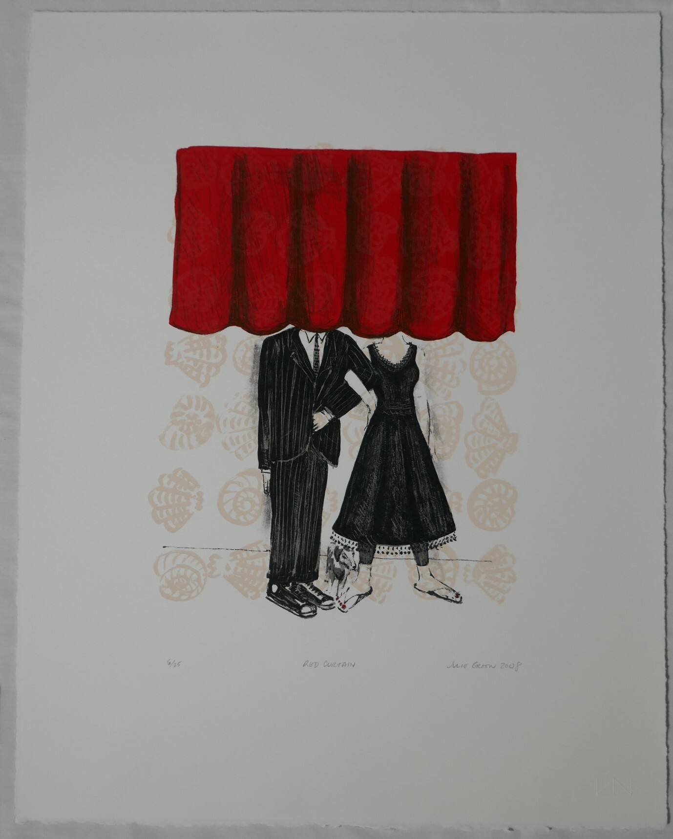 DescriptionAt the center of this vertically oriented image, a man (left) in a black pinstripe suit stands next to a woman (right) in a fringed sleeveless black dress with leggings and flip-flops. The pair stands arm-in-arm on either side of a little dog, their heads hidden by a pleated red curtain that extends from the top edge of the image about one-third of the way down. Pale gold shell-shapes decorate the wall behind them.Provenance