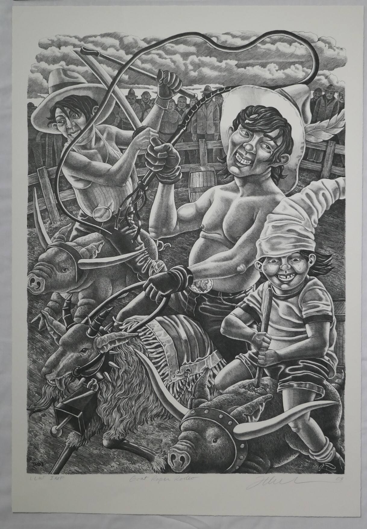 DescriptionBlack and white. In a rodeo arena under a cloudy sky, three figures (clowns, but not dressed as such) ride, left to right, a pig, a goat, and another pig. The pigs wear head straps with cow horns. The goat wears a large clanging bell around its neck and a rug on its back. Its rider, wearing a sombrero and gloves, is the largest figure. He holds the reins in his gloved proper left hand and cracks a long whip with his gloved proper right hand. The figure on the left also wears a sombrero, holds folding sticks in his bare hands. The figure on the right is a boy or dwarf in a long stocking cap, a tee shirt and shorts, and holds something upright with bare hands.